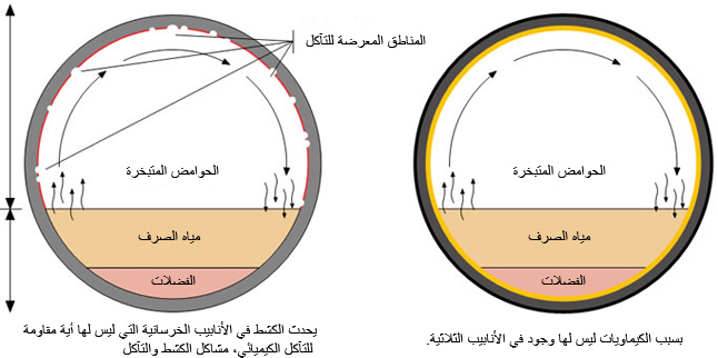 يجري تصنيع أنابيب فرات الثلاثية من مادة البولي إيثيلين الخام التي لها مقاومة عالية للمواد الكيميائية. خطوط أنابيب مياه الصرف تشكل نظام تدفق حر للمياه الملوثة بدون ضغط، وهي تعمل دون أن تمتليء. السوائل الحامضية والأملاح ذات التركيز العالي والبخار الحامضي الذي تطلقه الأوساخ الصلبة والسائلة تسبب تآكلاً في جدران الأنابيب. هذه العوامل تحدث كشطاً وتفككاً خاصة في الجدران الداخلية للأنابيب الخرسانية والمعدنية وتتسبب في حدوث تشوه خطير في بنية تلك الأنابيب. ولكن أنابيب فرات الثلاثية لها مقاومة مثالية للمواد الكيميائية، ولذلك فإن مشكلات الكشط والتآكل لاتحدث في هذه الأنابيب.
