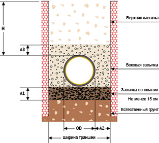 - Верхняя засыпка: минимально 30 см с нормальным уплотнением.