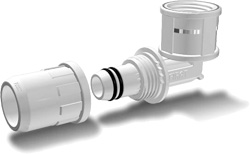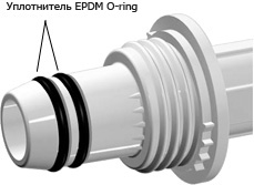Для обеспечения непроницаемости между трубой и фитингом, используются два уплотнителя EPDM O-ring.