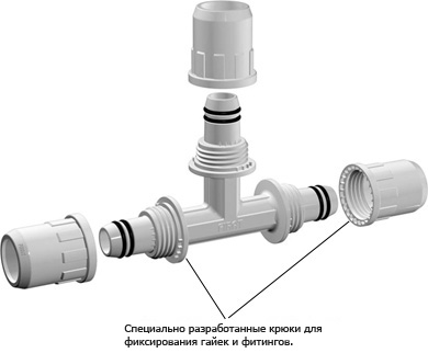 Одной из значительных особеннoстей систем фитингов PPSU является специально разработанной для прочного соединения конструкцией крюков, обеспечивающей фиксацию между гайкой и фитингом.
